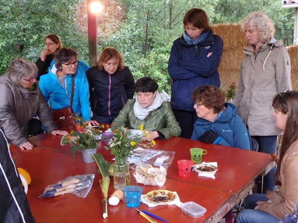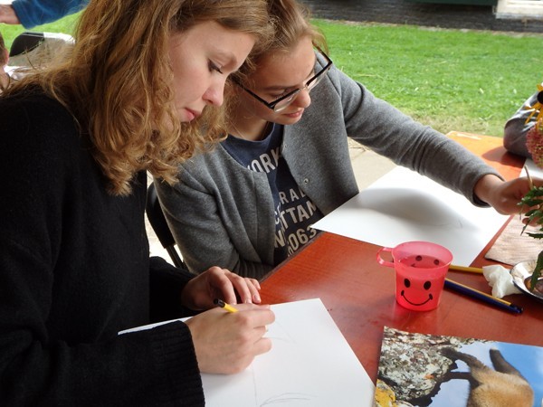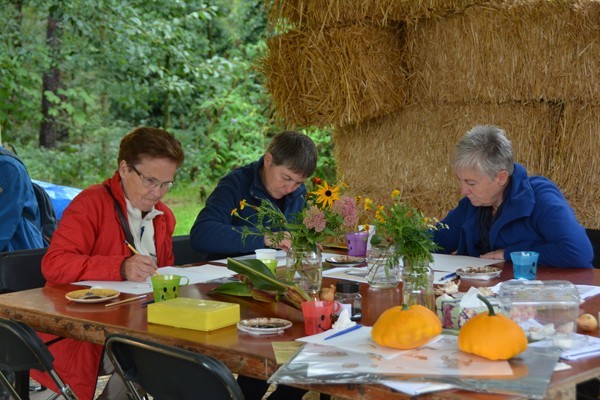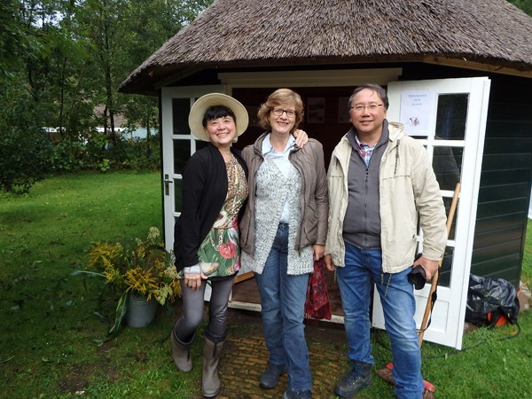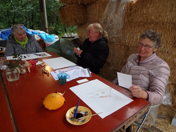 Hoewel vrijdag het water met bakken uit de hemel kwam, mocht ik vele bezoekers in het theehuisje verwelkomen. Dappere cursisten namen plaats onder de beschutting van de kapschuur en hielden stug vol. Dapper, omdat het papier soms met tape aan de tafel moest worden vastgeplakt zodat het niet de lucht in ging. En omdat de nattigheid je door en door koud maakte als je lang stil bleef zitten.