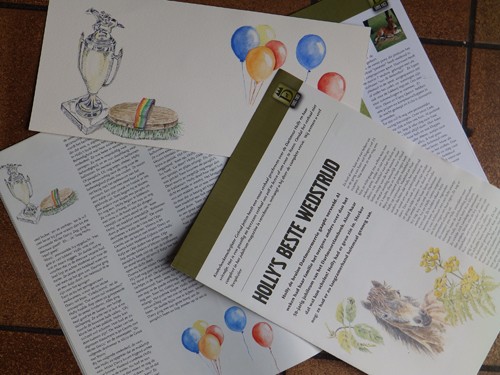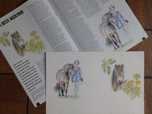 Ik had dit te danken aan mijn buurman Anton van Ingen, tevens voorzitter, die mij gevraagd had om illustraties te maken voor een verhaal dat in het jubileumblad zou verschijnen. Dat verhaal is speciaal voor de kinderen geschreven door kinderboekenschrijfster Gertrud Jetten. Samen met haar, Anne Pera en Evelyn van Ingen mocht ik in de promotiestand staan. Onze standbuurvrouw was Tineke Roorda, met expressieve paardenschilderijen, waarvan ze ook kaarten verkocht.