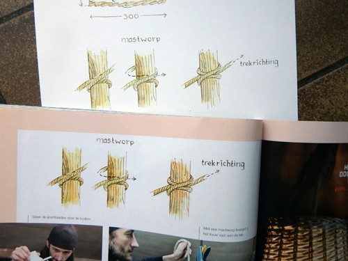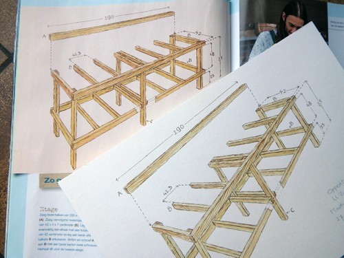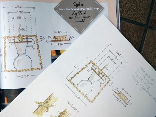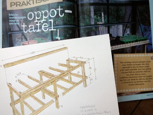 In het januarinummer 2020 vindt u de instructies voor de lamp. Hoe u de oppottafel maakt vindt u in het februarinummer. Hoe u het bonenrek en wormentoren maakt in het maartnummer. Ik maakte er de instructietekeningen voor in aquarel en bister.