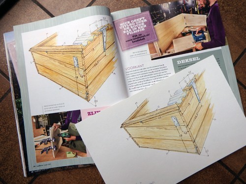 Nick van Zutphen ontwierp een zaaiwiel en een koude bak. Ik maakte de bouwtekeningen erbij in bister en aquarel.