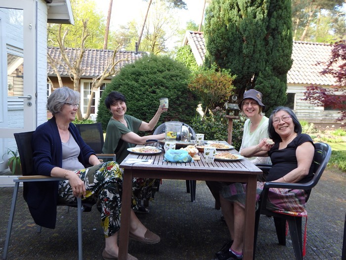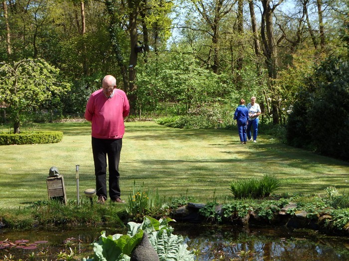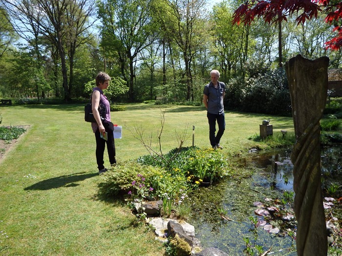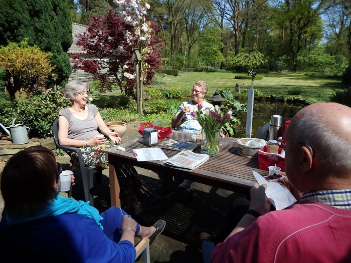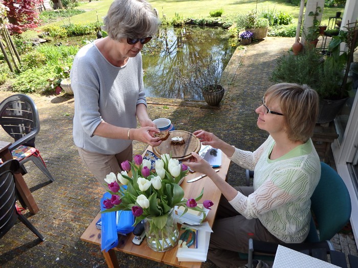 Ik ontmoette oude vrienden en maakte nieuwe contacten met mensen in de buurt die verrassende aandachtsvelden en hobbies hadden. Velen maakten na afloop nog een wandeling door de tuin waarin de lente losbarstte, of streken neer op het terras. Daar verkocht Liesbeth zelfgemaakte glutenvrije courgettecake, en samen met de verkoop van diverse plantjes leverde het nog heel wat op voor het goede doel (Compassion).
