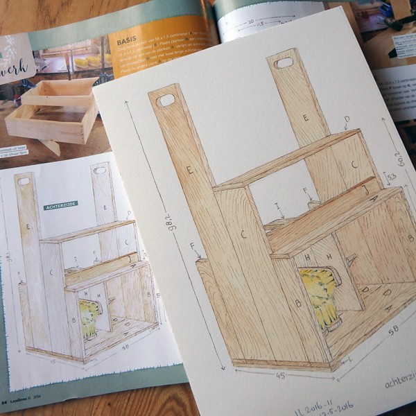 Bedenker Nick maakte dit praktische meubel en ik mocht voor Landleven 2016-10 de werktekeningen maken. Leuke klus!