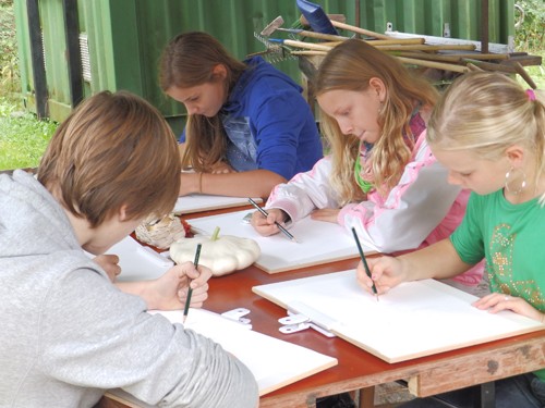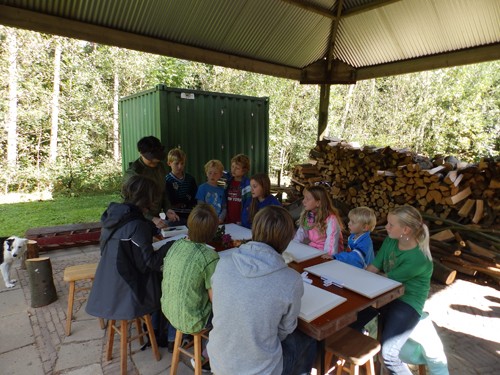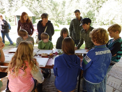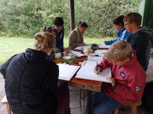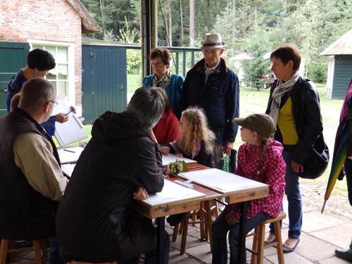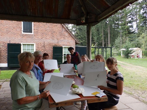 Soms was de tafel te klein voor iedereen die mee wilde doen. Gelukkig konden de tekenplankjes gewoon op schoot en kon iedereen die wilde, aanschuiven. De leeftijd van de deelnemers varieerde van 7 tot 50 plus. Iedereen was gemotiveerd en geconcentreerd bezig. Zelfs op de tweede dag, zaterdag 14 september, terwijl regen en windvlagen mijn stand teisterden, waren er deelnemers op beide workshops. Ze maakten veel goed van de dag, waarop ik samen met mijn helpers Greetje en Jan voornamelijk bezig was mijn aquarellen van het vocht te redden.