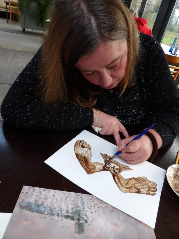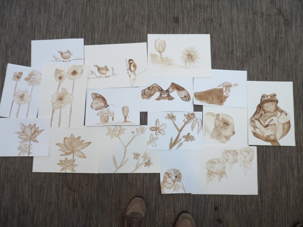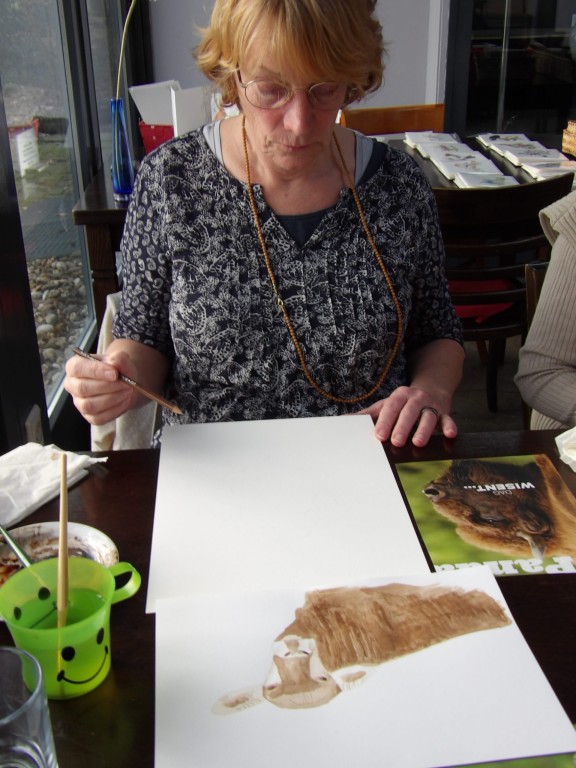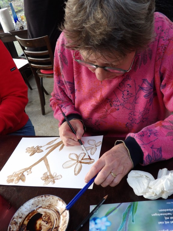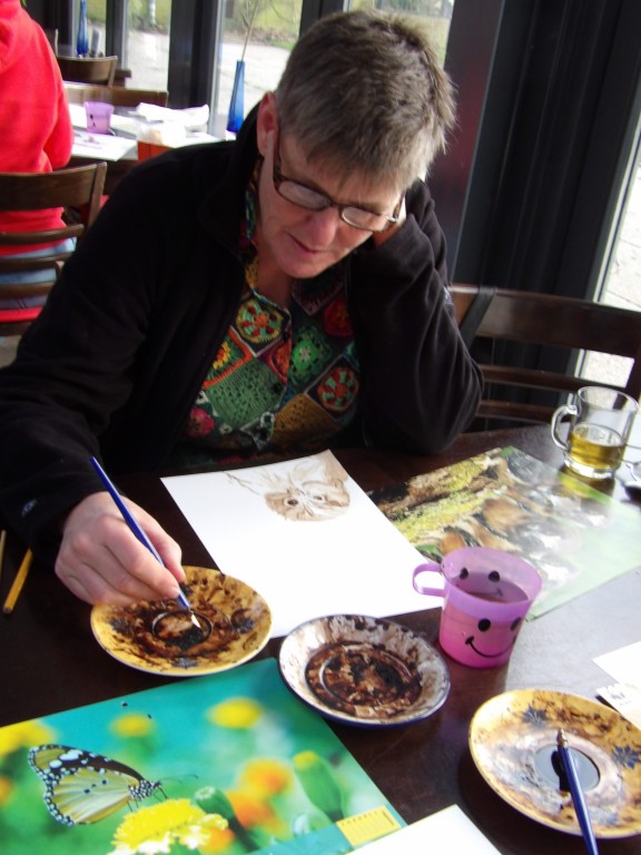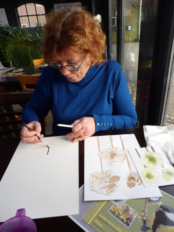 Bart Hiddinga van Theetuin Vierakker nodigde mij uit om een workshop te geven aan een aantal dames. De actieve deelnemers vormden samen een hecht spinning clubje en ze kwamen dan ook op de fiets van Zutphen naar Vierakker. Het was een verrassingscadeautje voor hun jarige clubgenoot, dus zij wist niet wat haar te wachten stond. Het werd tekenen met bister.