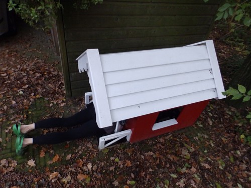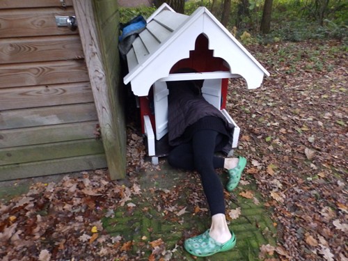 Waar ik daadwerkelijk in kroop was het hondenhok, dat weken op mijn oprit stond en waarvan ik ook een bouwtekening maakte. Ik moest immers weten hoe de binnenconstructie in elkaar zat. Nadat ik me met veel moeite in het hok had geperst (mijn benen staken eruit) en ijverig begon te meten, viel mijn blik op de punt van het dak. Nét boven mij. Een spin bekeek mijn verrichtingen. Geen kleine spin, waarvoor ik mijn schouders ophaal, maar zo'n - bijna handgrote - hardloopspin. Paniek! Ik wist niet hoe snel ik me uit het hok moest wringen.