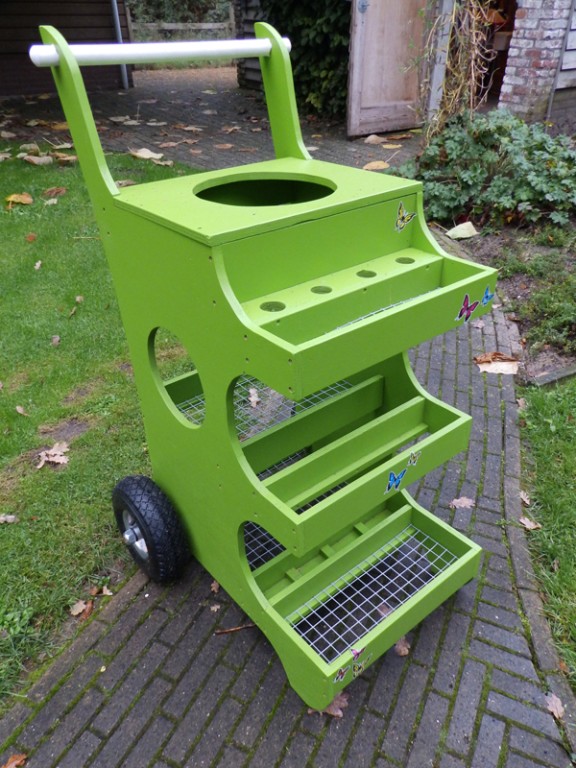 De tuintrolley mocht heel lang in mijn schuur staan. Een prachtig, fel-appelgroen wagentje waarmee je allerlei tuingereedschap handig kunt vervoeren. Een driedimensionale tekening ervan maken is echter andere koek. Ik kroop bijkans in het wagentje om alle maten op te nemen.