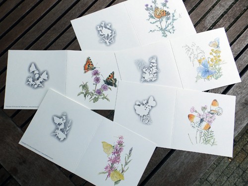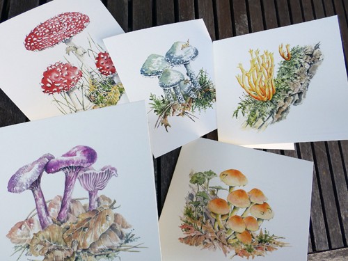 De paddenstoel-, vogel- en vlinderkaarten (13,5 cm x 13,5 cm; inclusief envelop) zijn 2,00 euro per stuk.