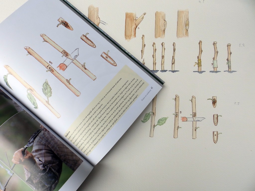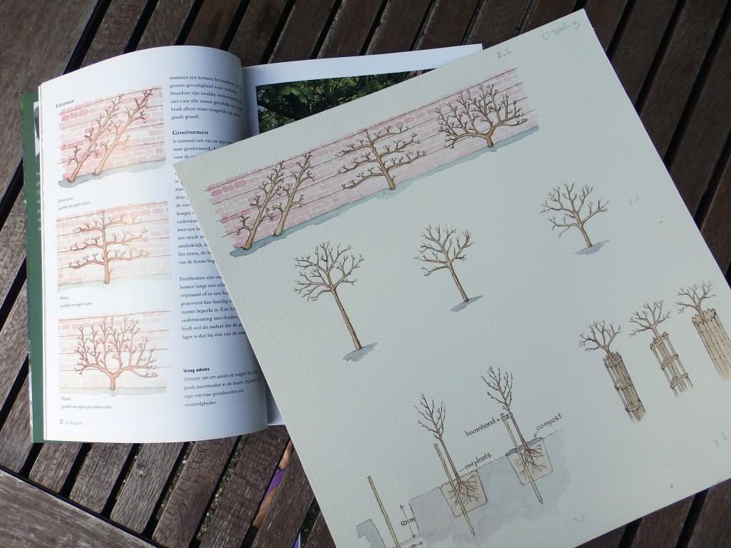 Voor het boekje De Bongerd zijn eerdere illustraties uit Landleven gebruikt. Boomvormen, snoeien, leivormen en enten worden hiermee zeer aanschouwelijk gemaakt.